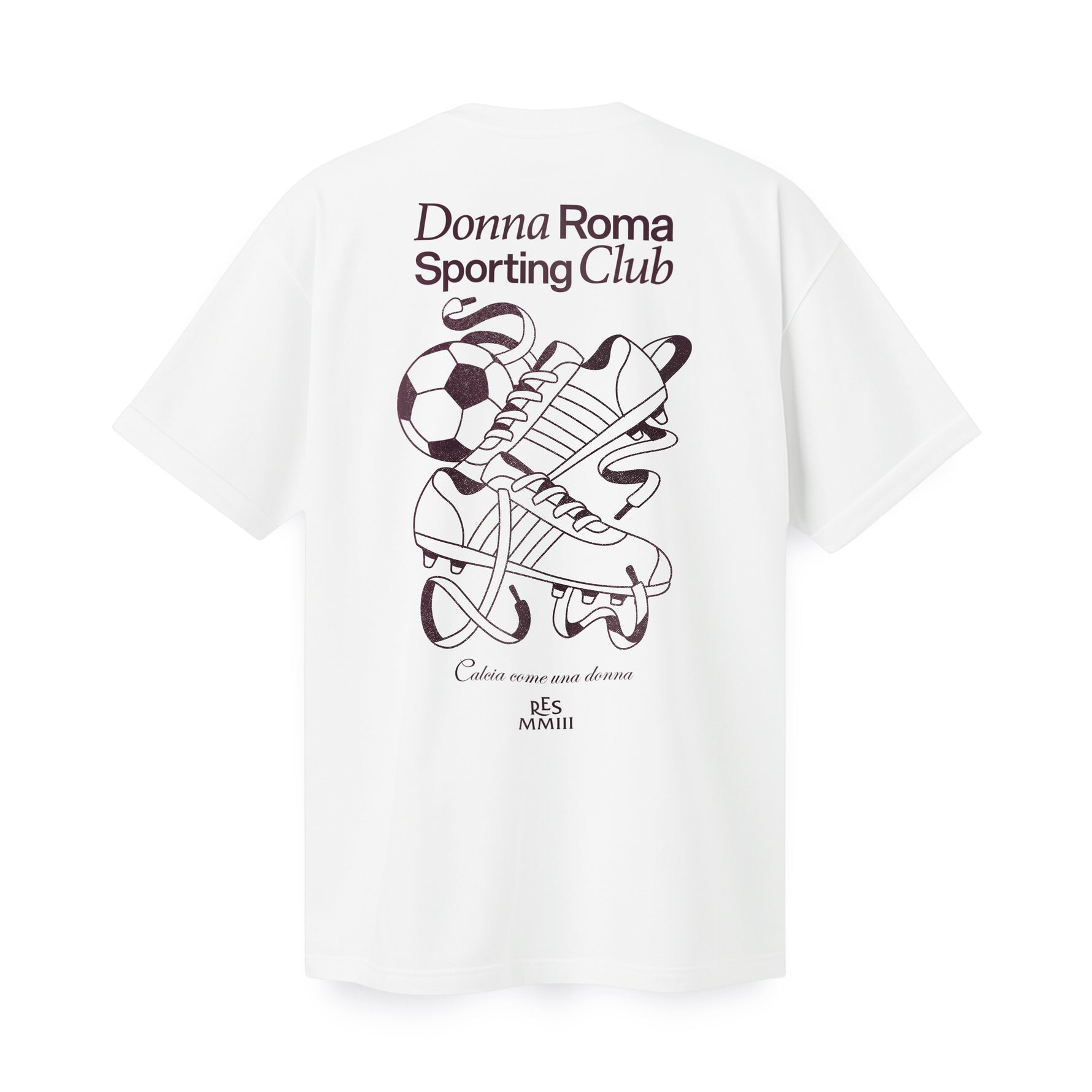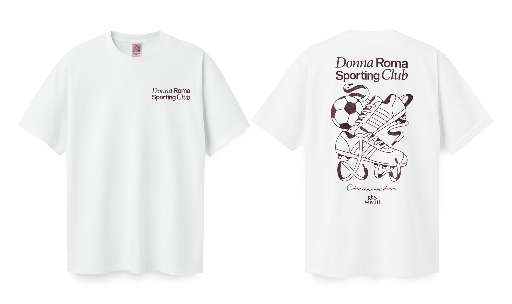 Prix unitaire / par Entrez dans l’univers Donna Roma avec le T-shirt Classique Sporting Club, là où la culture traditionnelle du soccer rencontre la force du sport féminin. Ce t-shirt blanc premium présente un logo minimaliste à l’avant et une illustration détaillée au dos, inspirée des visuels classiques des jours de match et la devise Calcio come una donna.